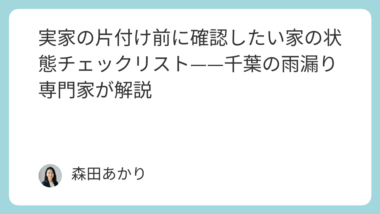 今回は、千葉県を中心に住宅の雨漏り・老朽化問題を専門とする村上健司さんに監修いただき、「実家の片付けを始める前に必ず確認すべき家の状態チェックリスト」を5項目にまとめました。遺品整理・生前整理に入る前の必読情報として、ぜひお役立てください。
